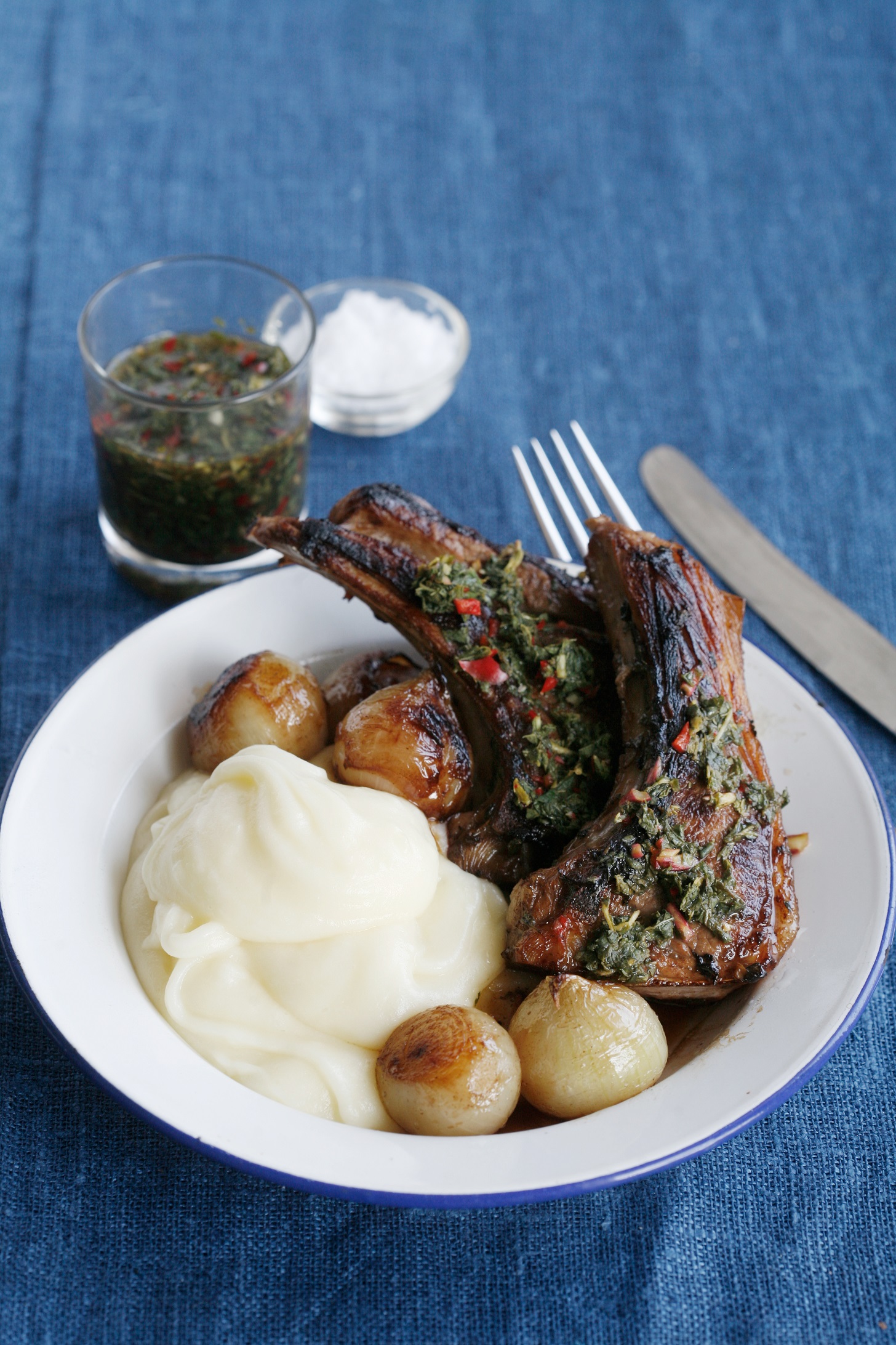 Lammekoteletter med sjalottløk, potetstappe og myntesaus, 3 porsjoner