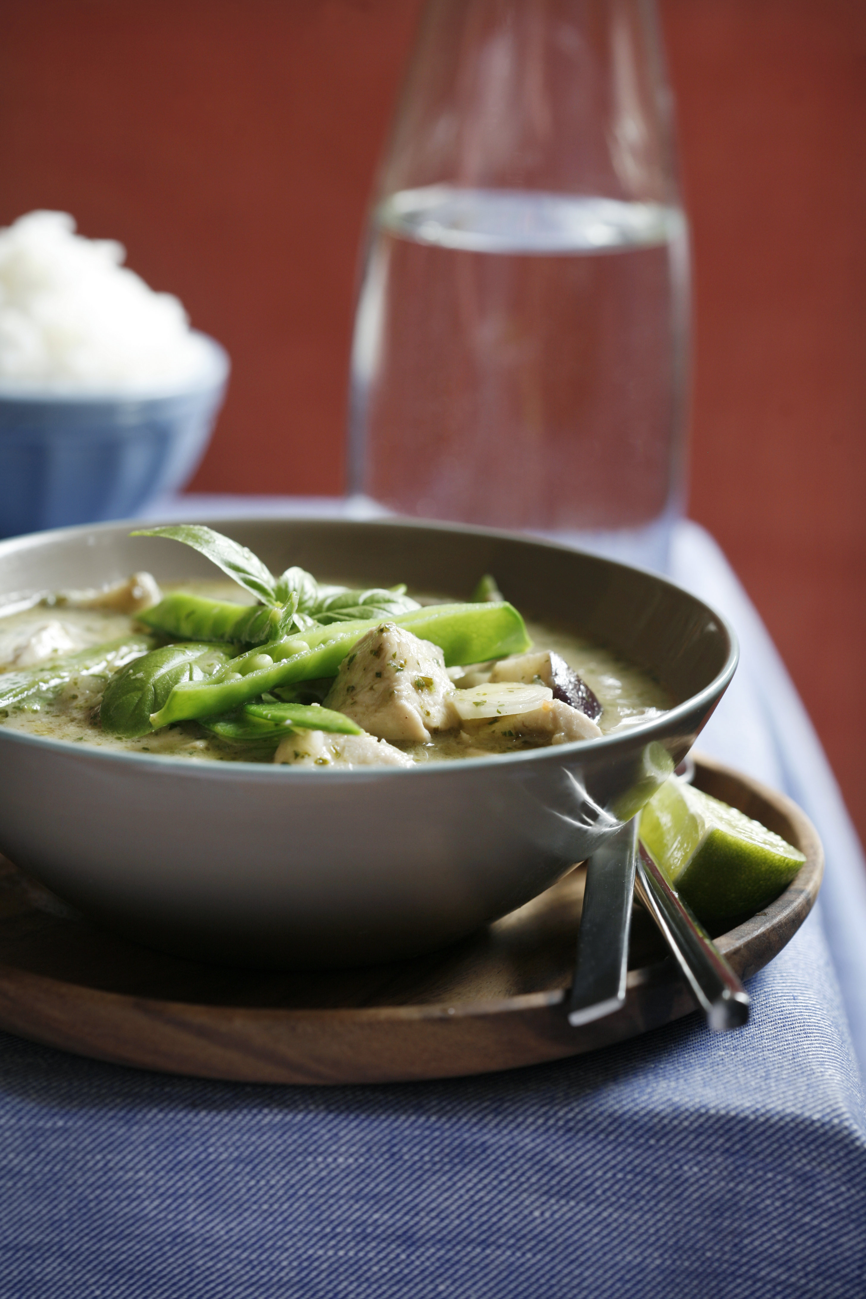 Ha olje i en stekepanne og surr auberginen i noen minutter. Tilsett currypaste, kokosmelk, buljong og fiskesaus og bland godt. Knus sitrongresstilkene ved å slå med baksiden av en kniv, og ha de deretter hele oppi gryten sammen med galangal. Ha i limeblad, sukker og kylling og la koke i ca. 8-10 minutter eller til kyllingen er mør. Ha i sukkerertene og vårløken når det er et par minutter igjen av koketiden. I mellomtiden tar du koriander, basilikum, spisskummen, hvitløk og limejuice samt limeskall i en kjøkkenmaskin, og mikser til en fin dressing. Hell over i gryten. Server med basilikumblad som garnityr, og jasminris på siden.