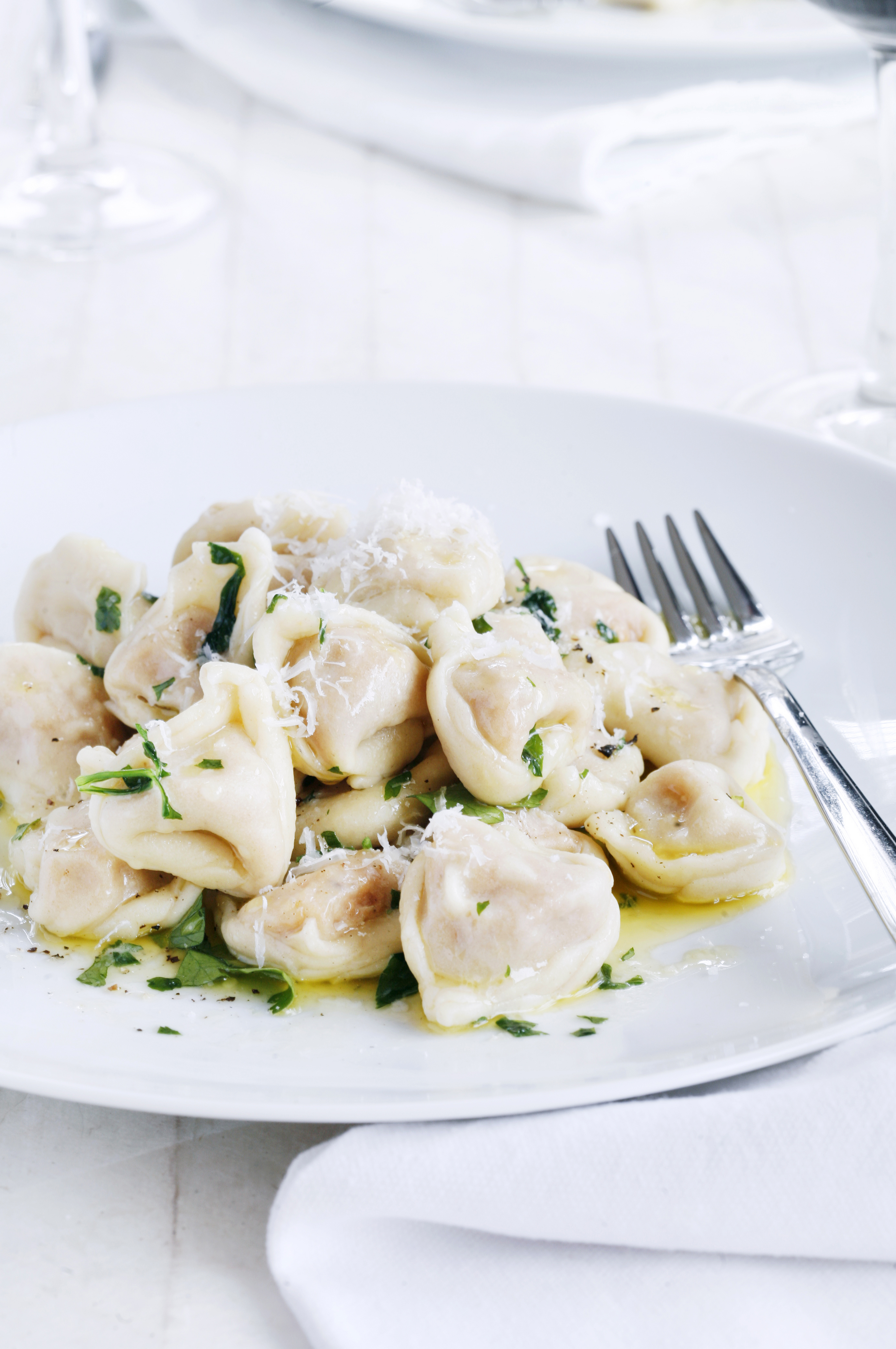 Smelt smøret og tilsett hakket persille. Kok tortellinien i ca. 2-4 minutter til de er myke. Fordel på serveringstallerkener og ha smørblandingen over. Kvern pepper og ha revet parmesan over hver tallerken og server umiddelbart.