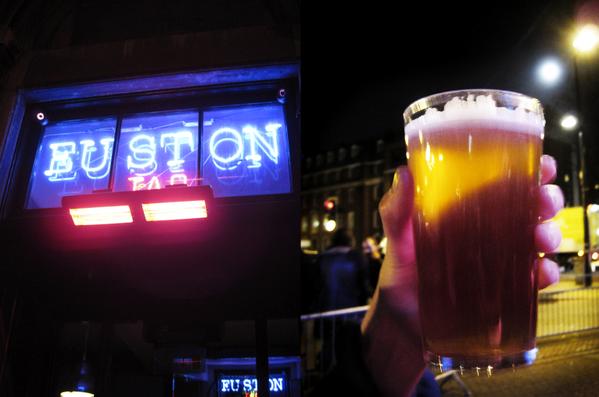 Utenfor Euston Tap er det fullt av folk omtrent hver kveld, så lenge det ikke regner. Det er noen få sitteplasser inne i andre etasje, men det beste er å stå eller sitte utenfor og slå av en prat med forbipasserende. Kanhende opplever du det vi har opplevd et par ganger; en irsk original kar som underholder samtlige gjester i tur og orden med å fortelle svært grove vitser. Han ler seg skakk ihjel etter hver vits han forteller, noe som smitter over på alle oss andre som gladelig gir ham noen pund som takk for forestillingen. Bedre pubopplevelse kan du ikke få, og forhåpentlig konverterer du til ale fra lager om du tar sjansen på å teste ut en ny type ale hver gang du bestiller. Bestill bare half pints for da får du testet ut så mange typer som mulig på en kveld.. Euston Tap