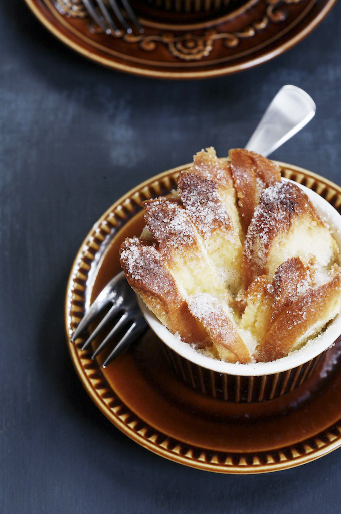 Bruk litt av smøret til å smøre 6 små ildfaste former på ca. 2 dl hver. Skjær briochen i tynne skiver og smør litt smør på begge sider av skivene. Del skivene i små biter på ca. 6×4 cm. og dander dem i formene. Pisk egg, fløte, melk, vaniljefrø og sukker, og hell blandingen over briochen. Smelt en liten klatt med smør og pensle over briochebitene som stikker opp. Dryss litt sukker over til slutt. Sett briochepuddingene i en langpanne og hell kokende vann halvveis opp til kanten på formene. Stek i vannbad på 160 grader i ca. 35 minutter, eller til eggeblandingen er satt og briochen er sprø og gyllen. Nyt briochepuddingene varme.
