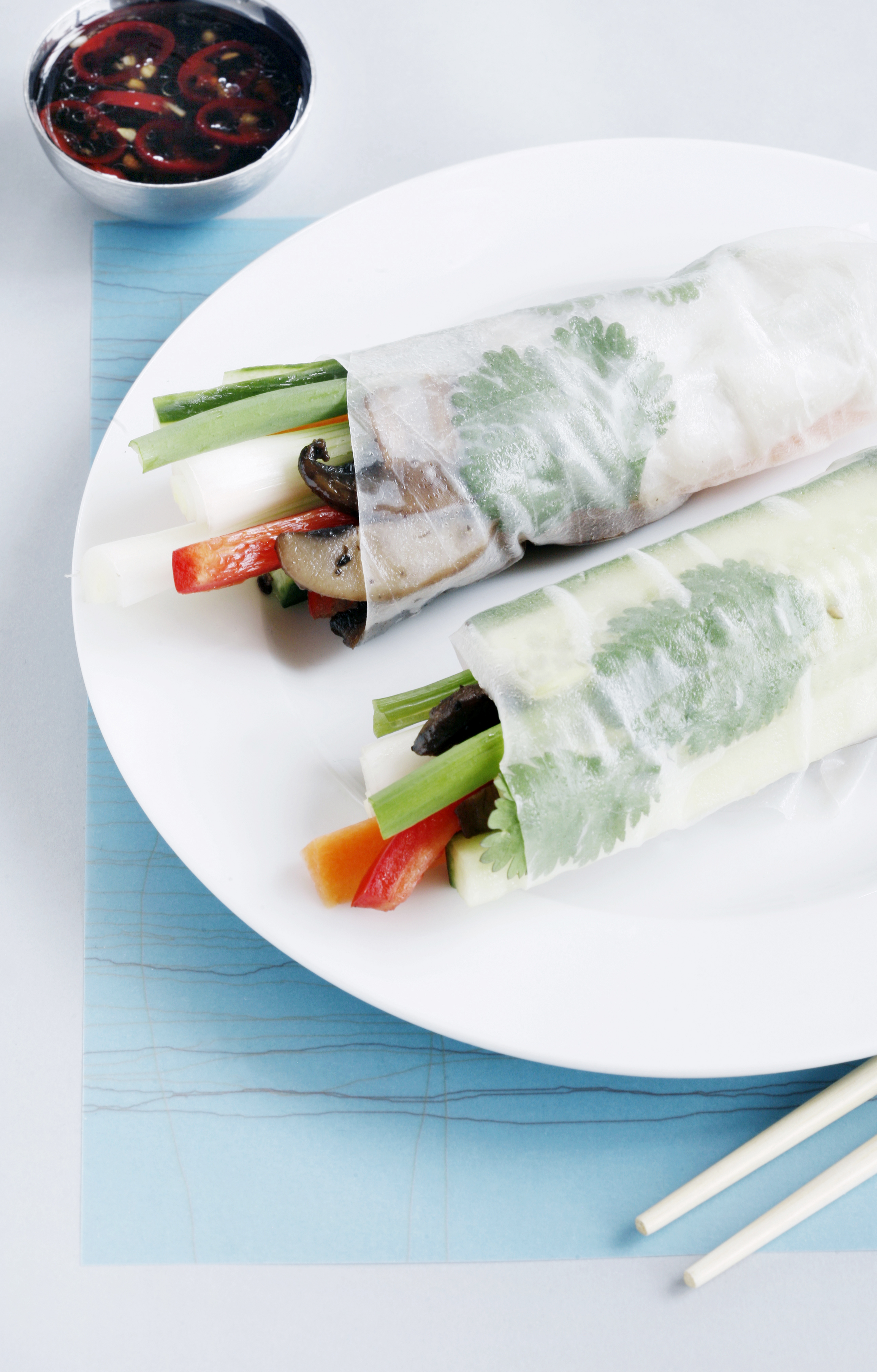 Rispapirruller med chillidipp, 4 porsjoner