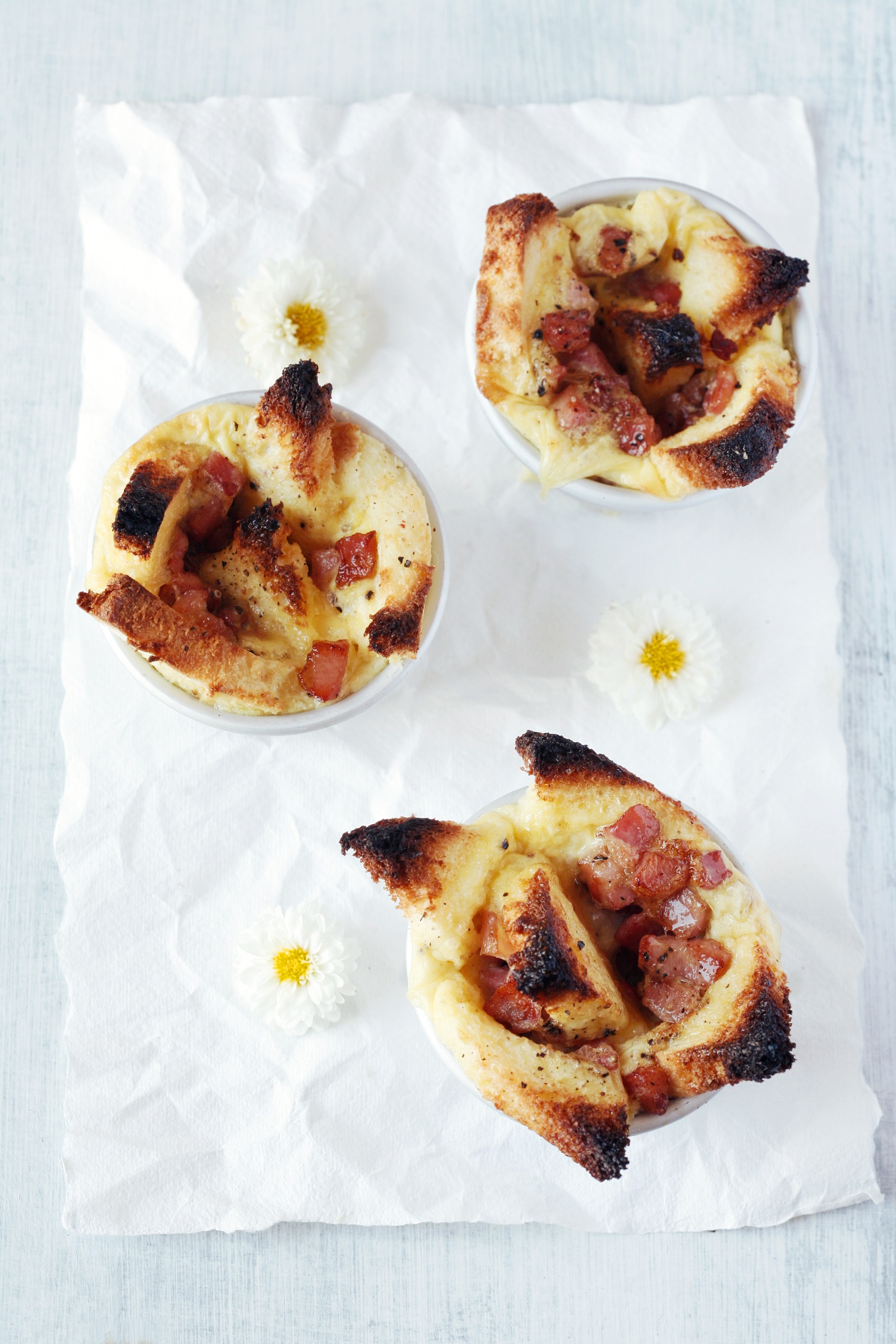 Stek baconbitene til det er gylne. Avkjøl. Pensle seks små ildfaste former eller metallformer med olje. Pisk egg og melk en bolle sammen med litt salt og godt med nykvernet pepper. Ha halvparten av baconbitene i blandingen. Plasser lofftrekanter i formene og hell eggeblanding over. Fordel resten av baconbitene på toppen. Pensle loffhjørnene som stikker opp. Stek i ovnen på 180 grader i ca. 15-18 minutter eller til egget har satt seg. Server med en gang.