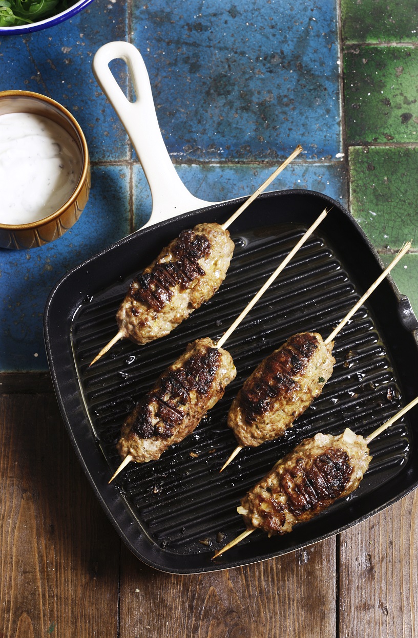 Sett ovnen til 180 grader. Ha alle ingrediensene i en bolle og bland for hånd. Form fire pølser av deigen og træ de over på fire grillspyd. Pensle en grillpanne med litt olje og grill lammespyd over middels til høy varme i ca. 3-4 minutter på hver side til de er gylne. Legg deretter lammespydene på et stekebrett med bakepapir og la de steke i ovnen i ca. 10 minutter eller til de er gjennomstekte. Server med mynteyoghurt, grønn salat og varme pitabrød.
