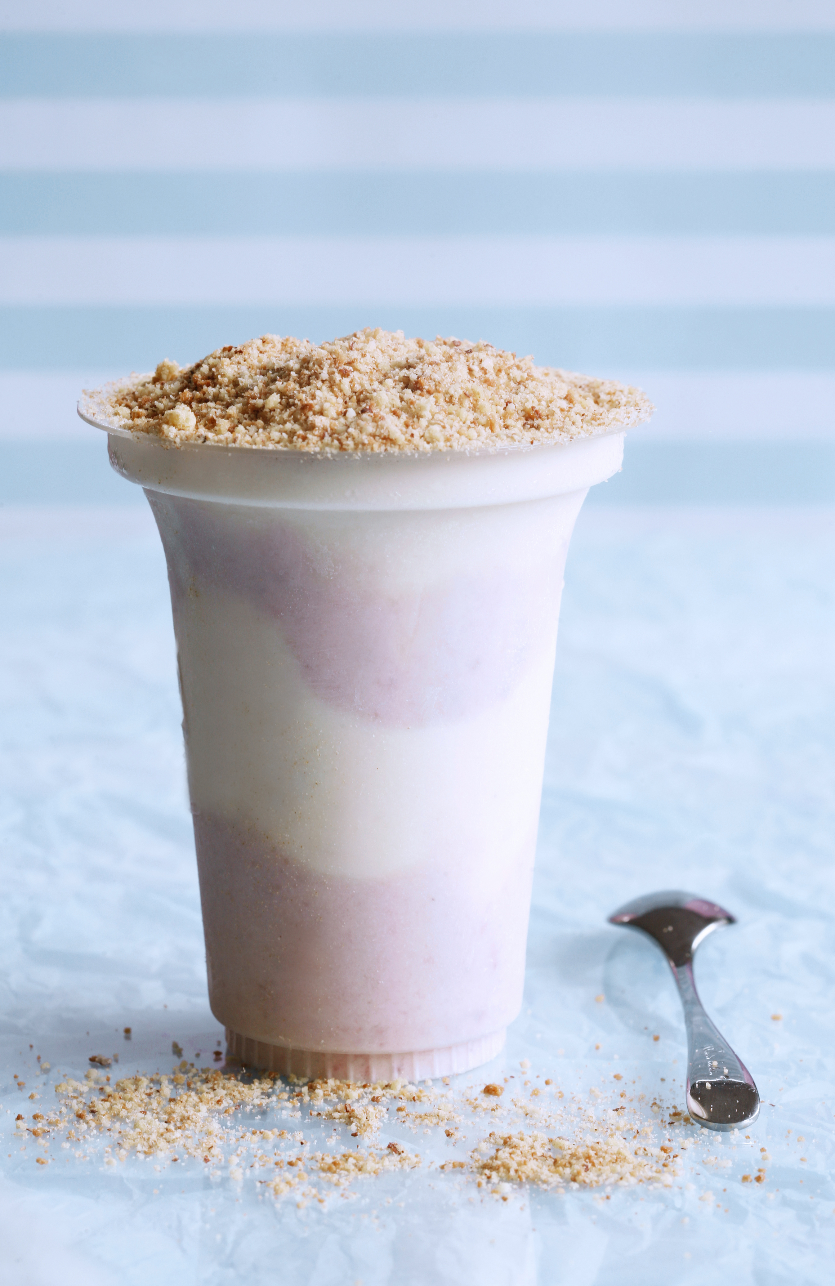 Pisk egg, eggeplomme og sukker til eggedosis over vannbad til det tykner. Ha fløten i en separat bolle og pisk den nesten stiv. Bland vaniljesukker inn i kremen og fold deretter inn i eggedosisen. Del blandingen i to og bland de moste jordbærene i den ene halvparten. Hell lagvis over i plastbeger og sett i fryseren. La stå i fem-seks timer eller over natten. Før servering drysser du biscotti på toppen av isen. Rekker til ca. fire begere.