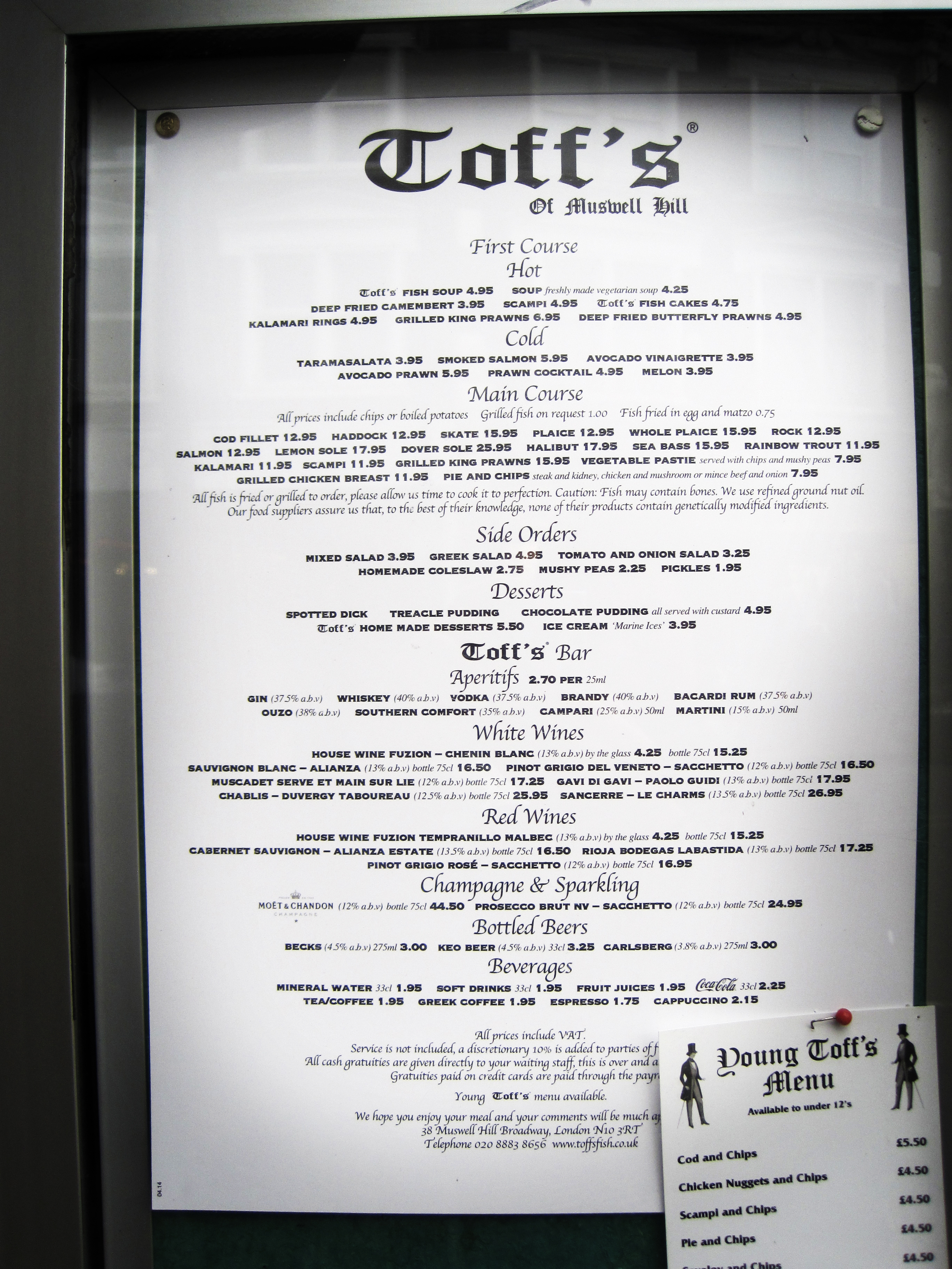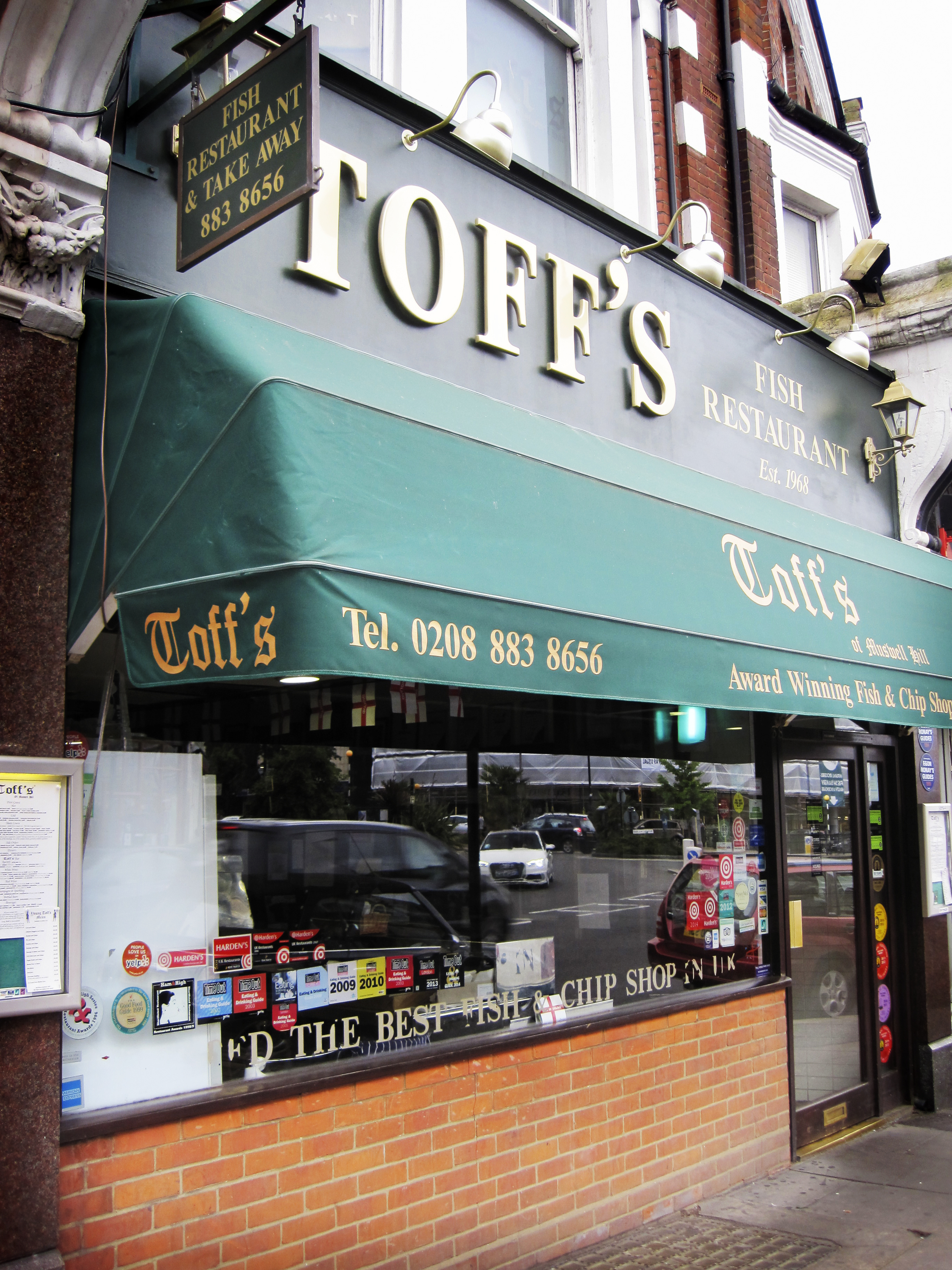 Toff’s er en prisbelønt fish & chips restaurant i Muswell Hill, nord i London. Dette stedet går for å være en av de beste – om ikke den beste – restaurantene for fish & chips i London. Sannsynlig er den av de beste i hele Storbritannia… All fisken deres kommer fra bærekraftig fiske, noe som flere og flere folk blir oppmerksomme på at er viktig når man skal spise fisk. Du kan sitte i godt gammeldags brunt interiør og nyte maten, eller du kan be om fisken wrapped up og ta den med deg til en benk ute i denne lille hyggelige landsbyaktige bydelen. Muswell Hill ligger på en av de høyeste punktene i London og det er mange grøntområder i nabolaget med Highgate Wood, Queen’s Wood og Alexandra Palace. Det er verdt turen opp hit bare for utsikten, men med super fish & chips i tillegg så har du en vinner av a day out fra sentrum av London. Ta kaffen på Sable d’Or og avslutt med en øl på uteserveringen ved Alexandra Palace med en av byens mest spektakulære utsikter (med unntak av toppen av kontorbygninger i sentrum..). Ikke glem å ta en spasertur bak Alexandra Palace hvor du finner en liten dam med et rikt fugleliv, samt båter du kan leie for en minitur.. Toff’s nettside finner du her.