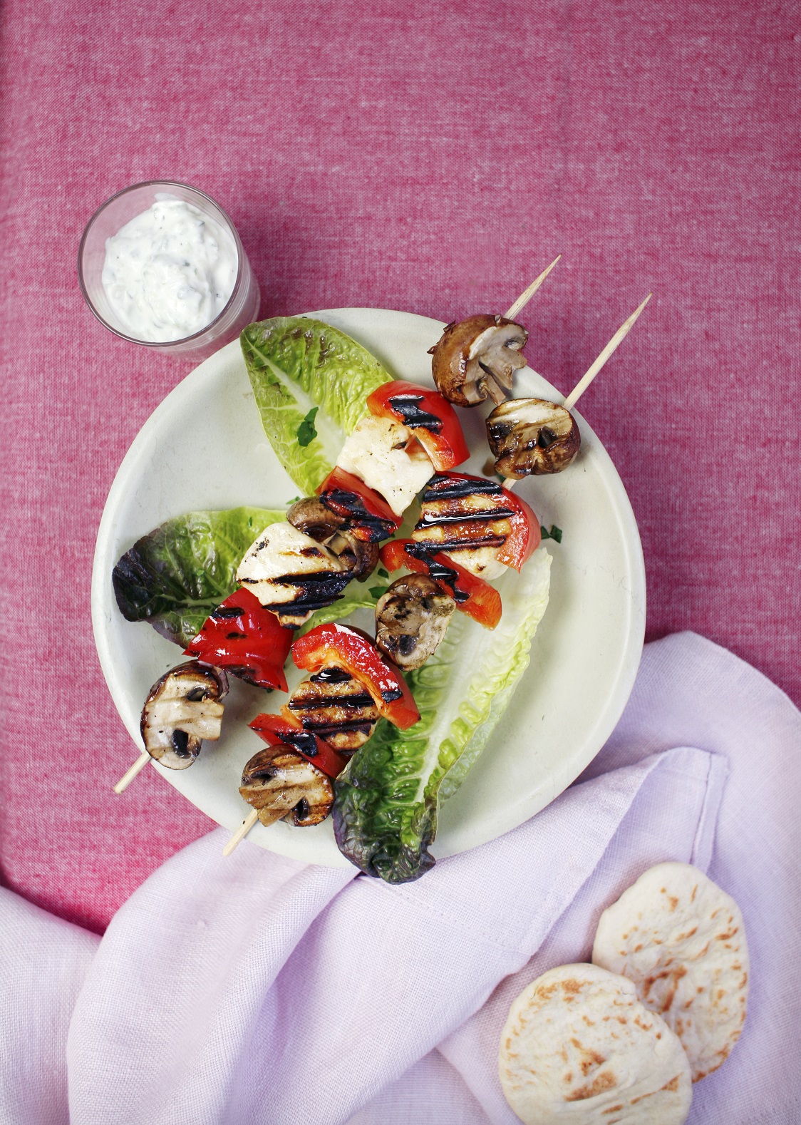 For tzatziki deler du agurken i to på langs og fjerner frøene. Riv agurken på et rivjern og ha den over på et tynt klede. Eventuelt kan du ha den over i en sil. Press så mye vann ut av agurken som mulig. Bland agurken sammen med yoghurt, hvitløk, sitronsaft og olje, og smak til med litt salt og pepper til slutt. Bløtlegg grillspydene i vann i 5-10 minutter før grilling slik at de ikke brenner over grillen (med mindre du bruker metallspyd). Træ sopp, paprika og halloumi på grillspydene og pensle med litt olje. Dryss litt salt og kvernet pepper over og grill i et par minutter på hver side. Server med tzatziki og varme pitabrød.