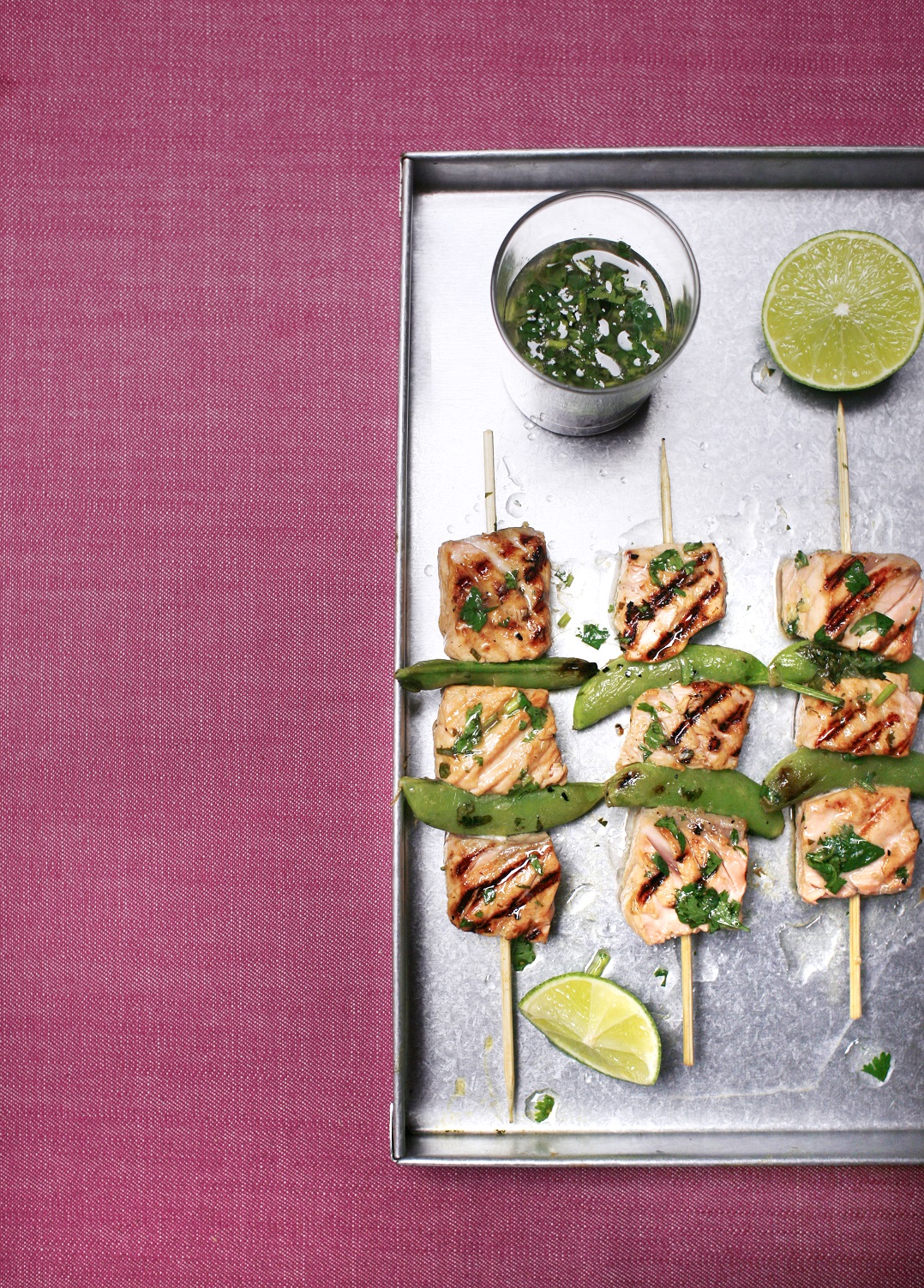 Marinerte laksespyd med lime- og korianderdressing, 8 spyd