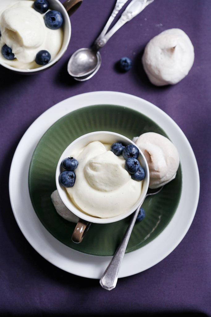 Dette er en lekker liten dessert! For å gjøre jobben enkel før servering kan du lage marengsene kvelden i forveien. Bruk gjerne bringebær istedenfor blåbær. Eller du kan ha revet sjokolade og hakkede mandler over. Eller hva med appelsincurd? (bruk lemoncurd-oppskrift og erstatt sitronskall og -saft med 1 1/2 appelsin). Bruk fantasien – denne oppskriften er et bra utgangspunkt for eksperimentering…