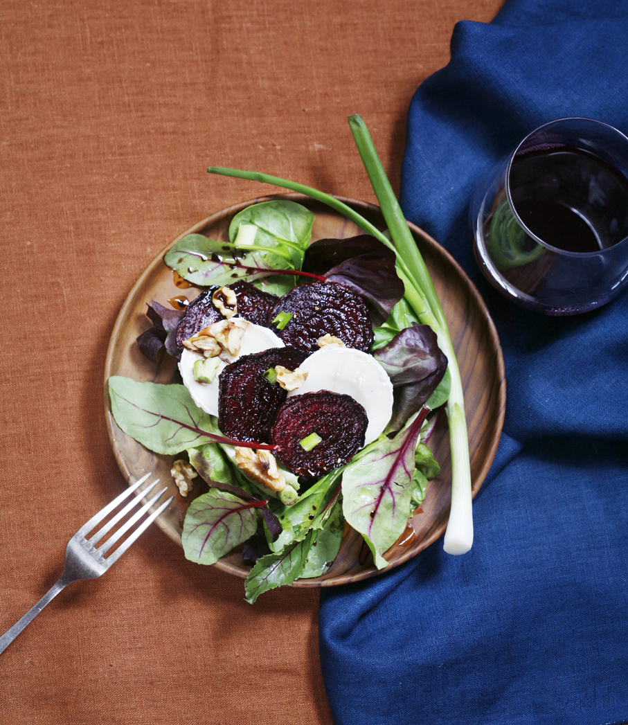 Sett ovnen til 200 grader. Pensle en langpanne med litt av oljen. Ha litt salt og pepper på den ene siden av rødbetskivene og legg dem ned i langpannen. Pensle resten av oljen og ha litt salt og pepper over skivene. Ha balsamico over til slutt. Bak i ovnen i ca. 25-30 minutter eller til rødbeten er mør. Riv salatbladene og ha dem over i en serveringsbolle sammen med chevre, valnøtter, vårløk og bakt rødbete. Bland inn dressingen. Server gjerne som siderett eller som forrett med ferskt brød til. Hvis du skal ha salaten som lunsj på jobben baker du rødbetene som over og bruker 1/4 av de andre ingrediensene til din lunsjporsjon. Resten av de bakte rødbetene kan du spise til middag eller du kan repetere lunsjen i et par dager.