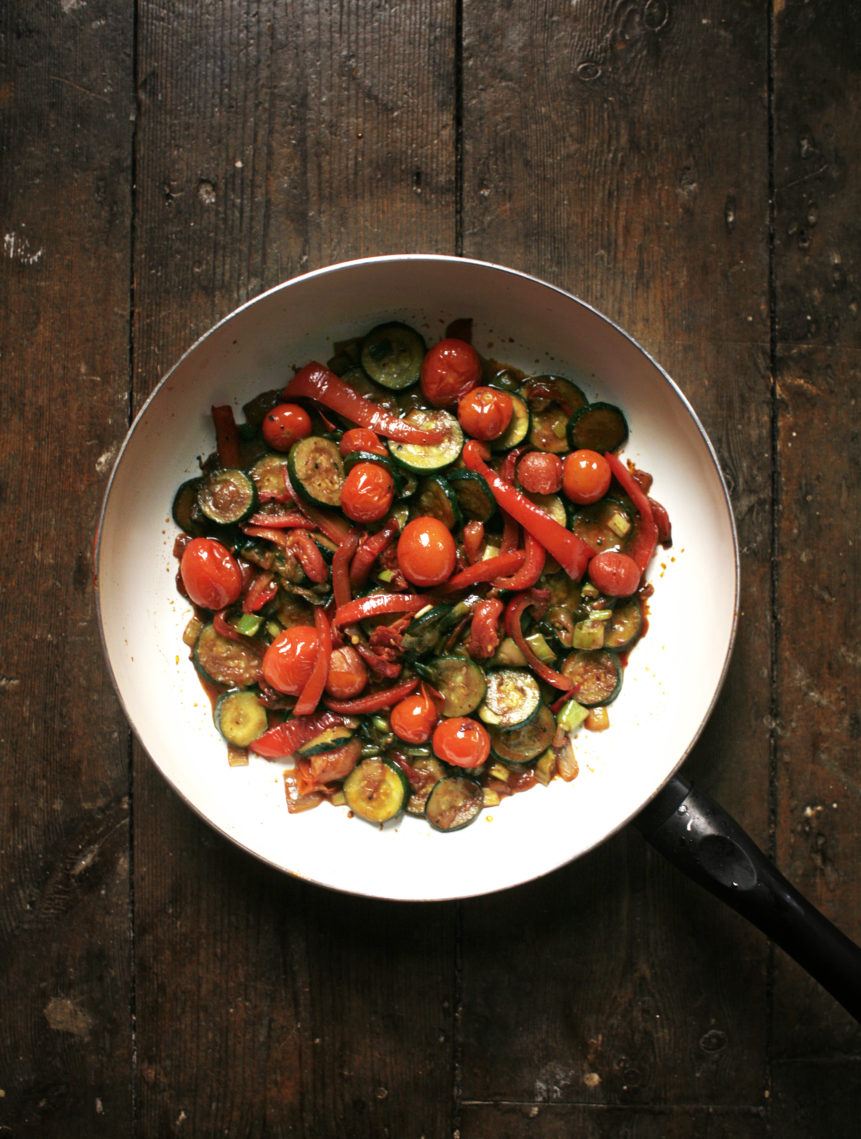 Varm opp halvparten av oljen i en stekepanne og surr løken i et par-tre minutter. Tilsett squash, chili, paprika, resten av oljen samt paprikapulver og godt med salt, og surr i 4-5 minutter til. Ha cherrytomatene over i pannen og la det surre i ytterligere 3-4 minutter til tomatene begynner å bli myke. Ha deretter i vann, balsamico og vårløk, og la det småboble i noen minutter til det begynner å tykne litt. Smak eventuelt til med litt kvernet pepper. Servér med en gang.