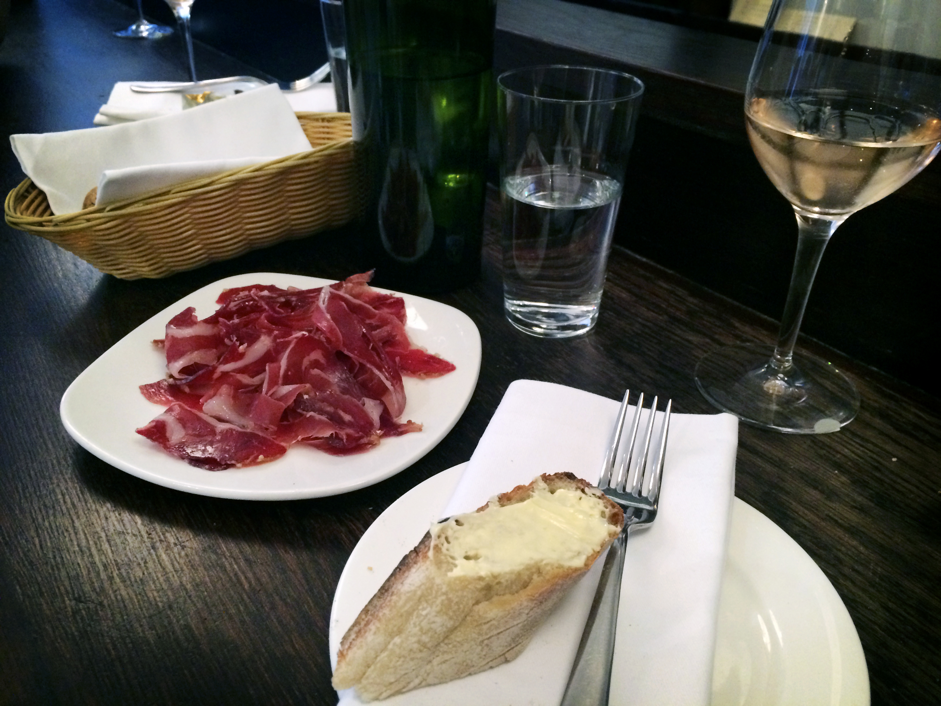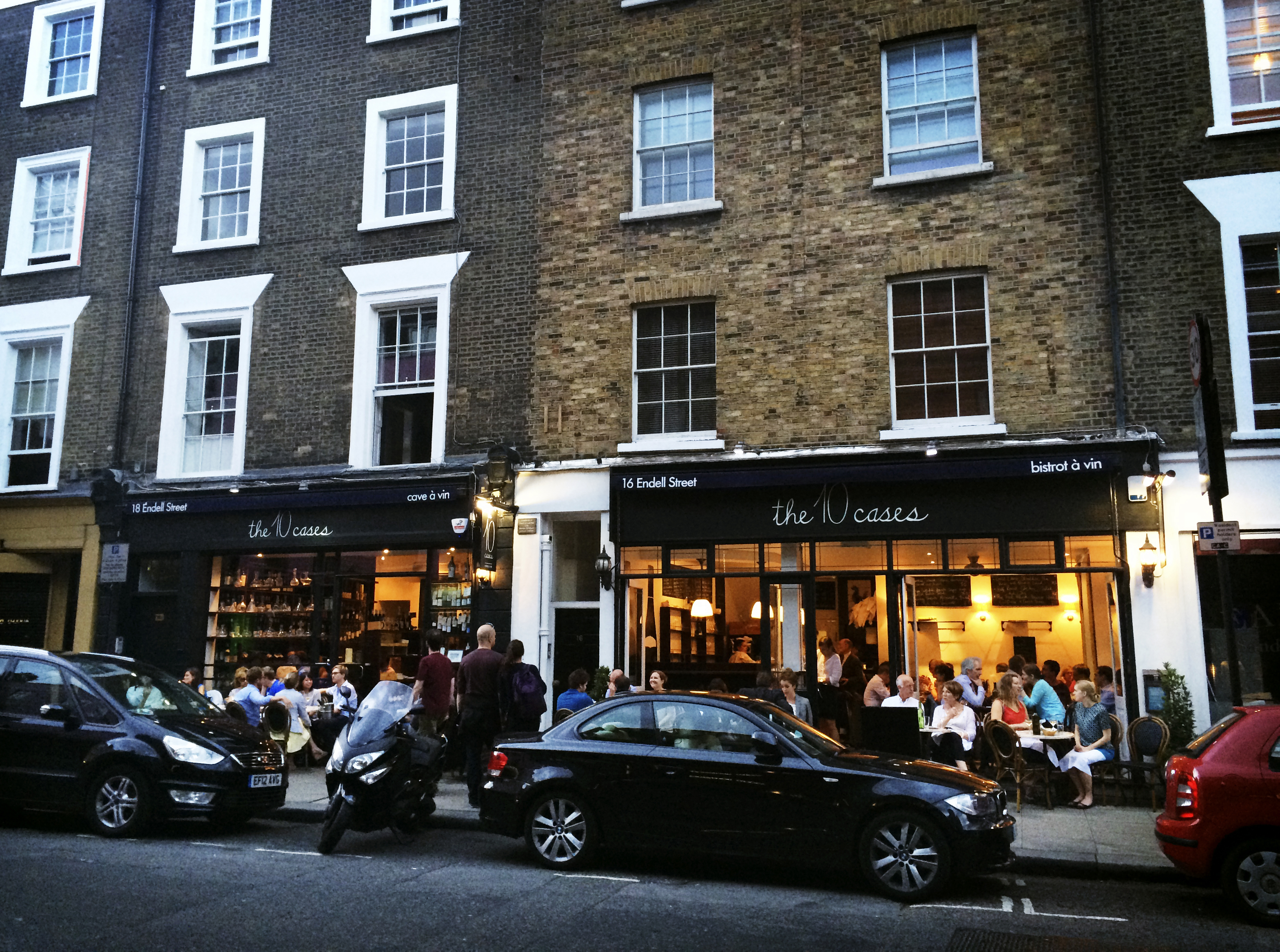 Navnet The 10 Cases ble valgt fordi eierene av vinkjelleren ikke ville ta inn mer enn ti kasser av samme vin, men heller prøve nye ting hele tiden. Du vil finne viner fra hele verden, og prisene starter på rundt 24 pund for en flaske. Sist vi besøkte drakk vi Alicante Bouschet ‘Aromes Sauvage’ Domaine de Viranel 2012, for 26.50. Du kan også ta et glass husets for 3-4 pund. Det serveres ost, oliven, ansjos, nøtter m.m., samt et godt utvalg spekeskinke, noen småretter og et par større retter. Crème brûlée og sjokolademousse tilbyr de også… Gå til Bistrot à Vin for en mer omfattende meny for fulle måltider.