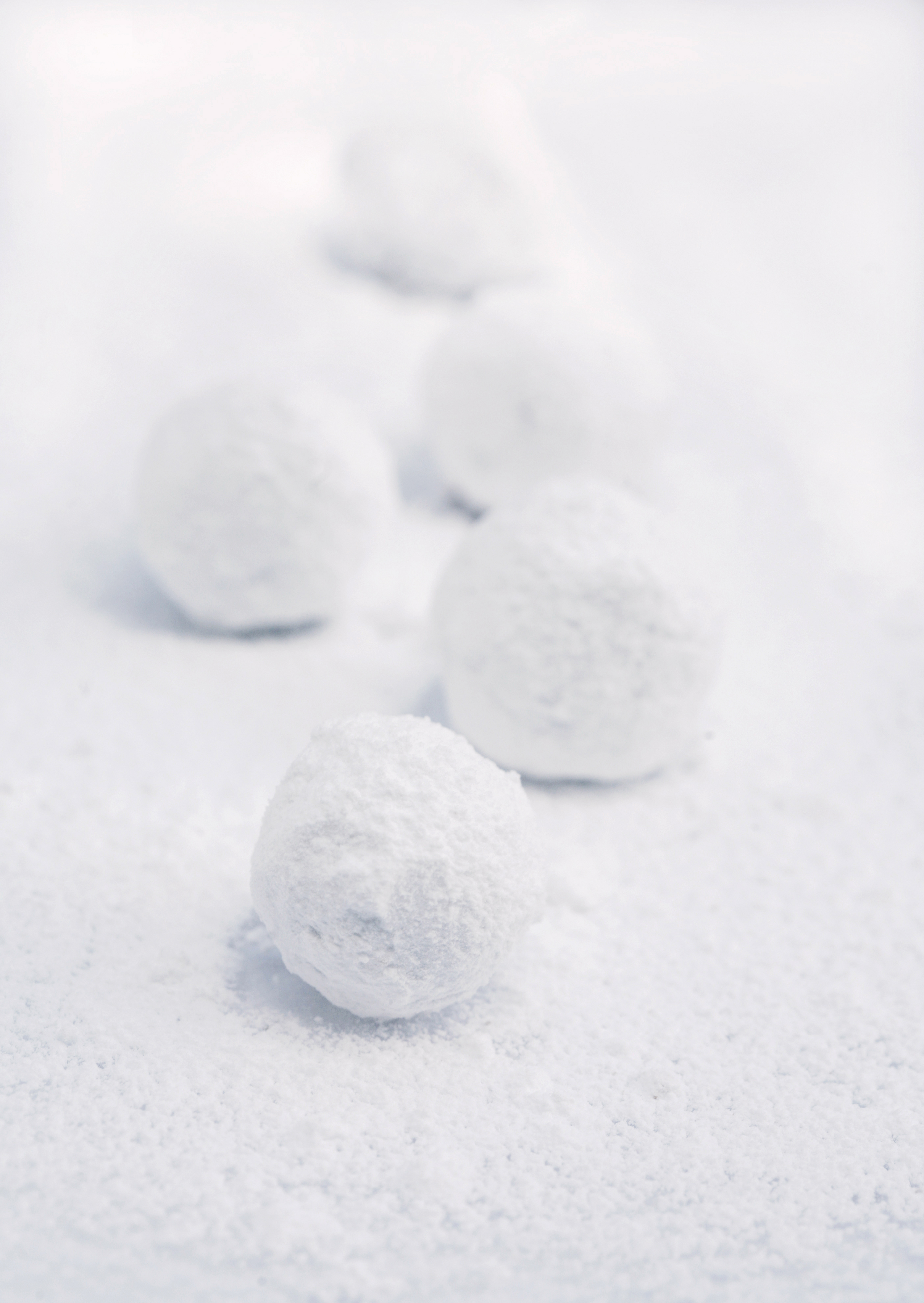 Sett fram en stor tallerken eller brett på benken, og ha litt melis i en liten bolle. Bruk en melonkuleskje til å forme runde kuler av skjokoladen. Rull kulene raskt mellom hendene før de legges i bollen med melis. Ikke rull dem for lenge, da smelter sjokoladen lett. Dekk kulene helt med melis og legg deretter på brettet. Sett trøflene i kjøleskapet i en times tid før servering.