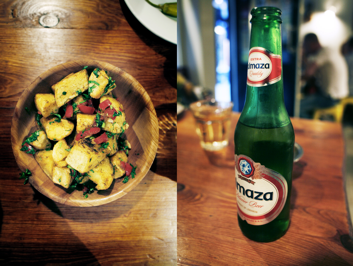 Vi bestilte en forrett på deling, da vår erfaring med kjøkken fra midtøsten er generøse porsjoner. Forretten var en porsjon med nydelige myke og ovnstekte poteter krydret med blant annet koriander, kumin og fersk persille. Til hovedrett hadde vi lammespyd og moussaka.