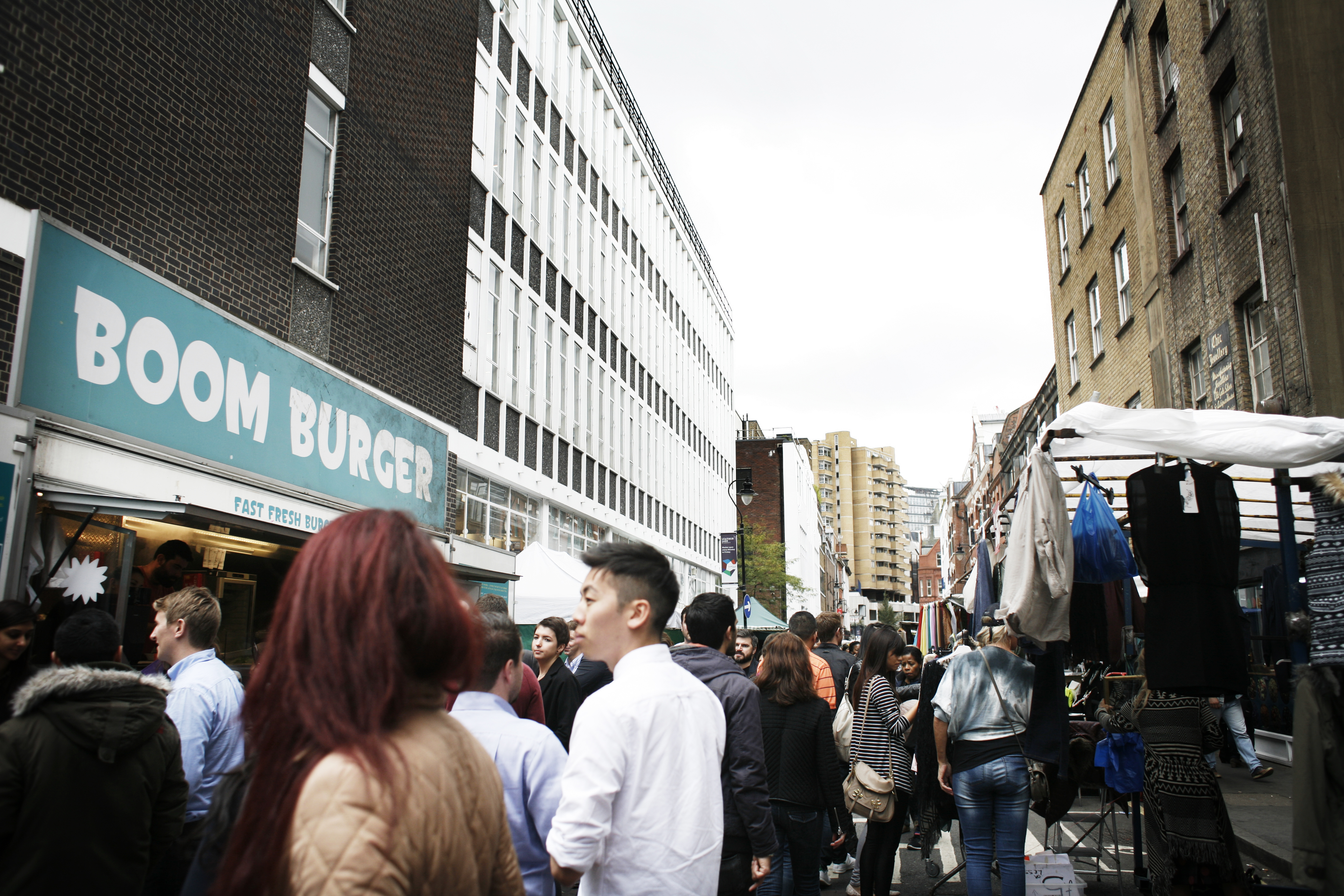 Leather Lane i Clerkenwell forvandles til en tettpakket stående buffet gate mellom 13.00 og 14.00 hver ukedag. Da er det nemlig lunsjtid for alle londonere, og på Leather Lane finnes mange matboder. Du må regne med å stå litt i kø her, men det er verdt det. Og mens du spiser din valgte takeaway kan du kikke på håndvesker, bøker, planter, klær og andre ting som selges i denne markedsgaten.