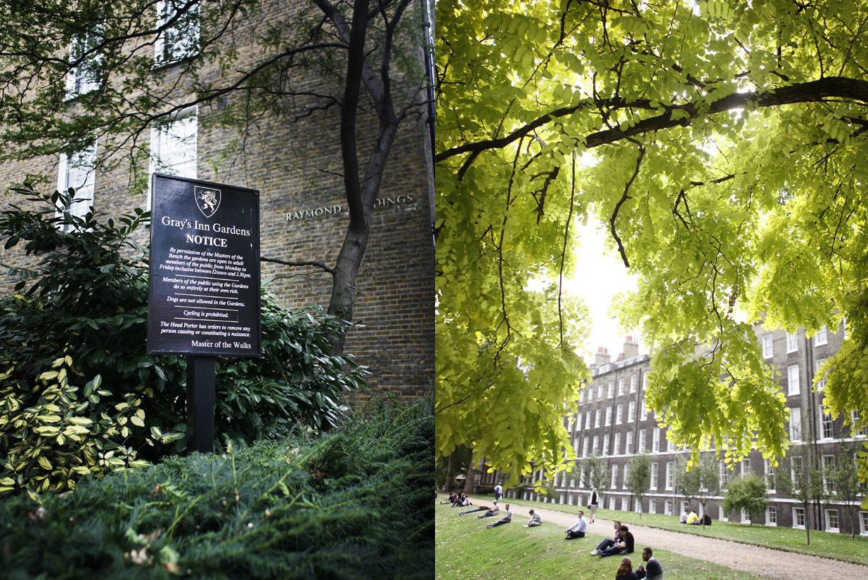 Mange som kjøper lunsjen sin på Leather Lane tar den med litt videre opp Clerkenwell Road mot sentrum og smetter inn i Grey’s Inn. Dette er en liten grønn lunge midt i byen hvor The Honourable Society of Gray’s Inn holder til. Dette er et sted med både arbeidsplasser og boliger for advokater i London. Denne hagen er privat, med unntak av på ukedager mellom kl. 12 og 14.30. Da kan hvem som helst sette seg ned og spise lunsjen sin, eller bare ta en liten pust i bakken fra trafikkaoset rett utenfor.
