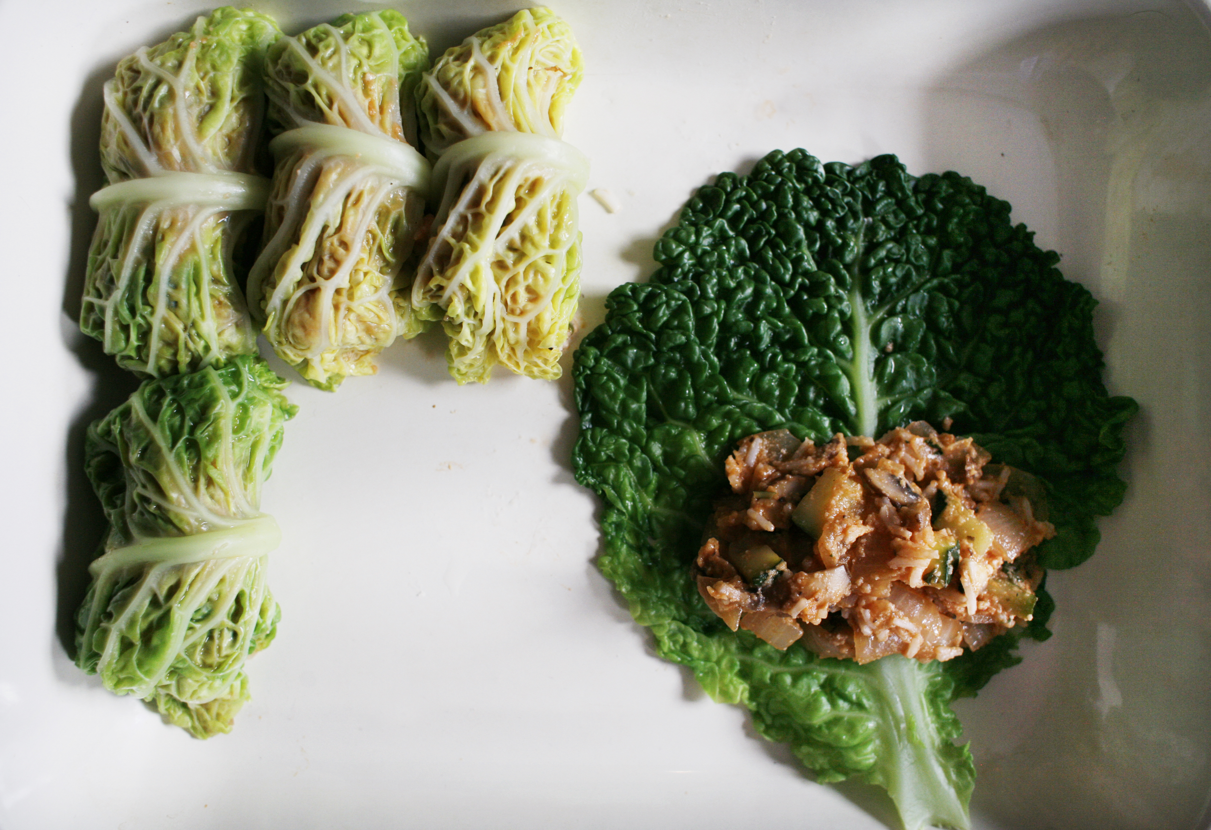 Skyll kålen men ikke ta bladene fra hverandre. Kok opp lettsaltet vann i en stor kjele og la kålen koke i 3-4 minutter til den er litt mør. Hell av vannet og tørk bladene med papir. Ikke kok for lenge for da går de tynneste bladene i stykker og det blir vanskelig å rulle dem senere. Varm oljen i en stekepanne og surr løk og sopp i 4-5 minutter til det har myknet. Tilsett squash, hvitløk og basilikum og surr i et par minutter til. Bland inn passata, parmesan, ris, brødsmuler og mozzarella og smak til med salt og pepper. Ta pannen av platen og la stå i noen minutter til brødsmulene har svellet. Om det blir for tørt kan du tilsette litt vann, men du skal ha en ganske fast blanding slik at det blir lettere å rulle ruletter. Gjør klar en ildfast form. Ha ca. en spiseskje med fyll på hvert kålblad og fold over en gang før du bretter sidene inn og ruller sammen til en rulett. Legg over i formen med skjøten ned. Rull alle bladene, selv de aller minste – du kan lappe litt sammen her og der og presse dem sammen i formen. Det er mulig det blir litt blanding til overs, avhengig av hvor stor kålen du bruker er. Ha aluminiumsfolie over og bak i ovnen i en drøy time. I mellomtiden lager du tomatsausen ved å ha alle ingrediensene over i en liten kjele og lar det boble over middels varme i 6-7 minutter. Du kan ha en dash med balsamico i sausen om du vil. Serever rulettene med varm saus over. Disse rulettene kan du fint spise dagen etter. De er like gode da – om ikke bedre..