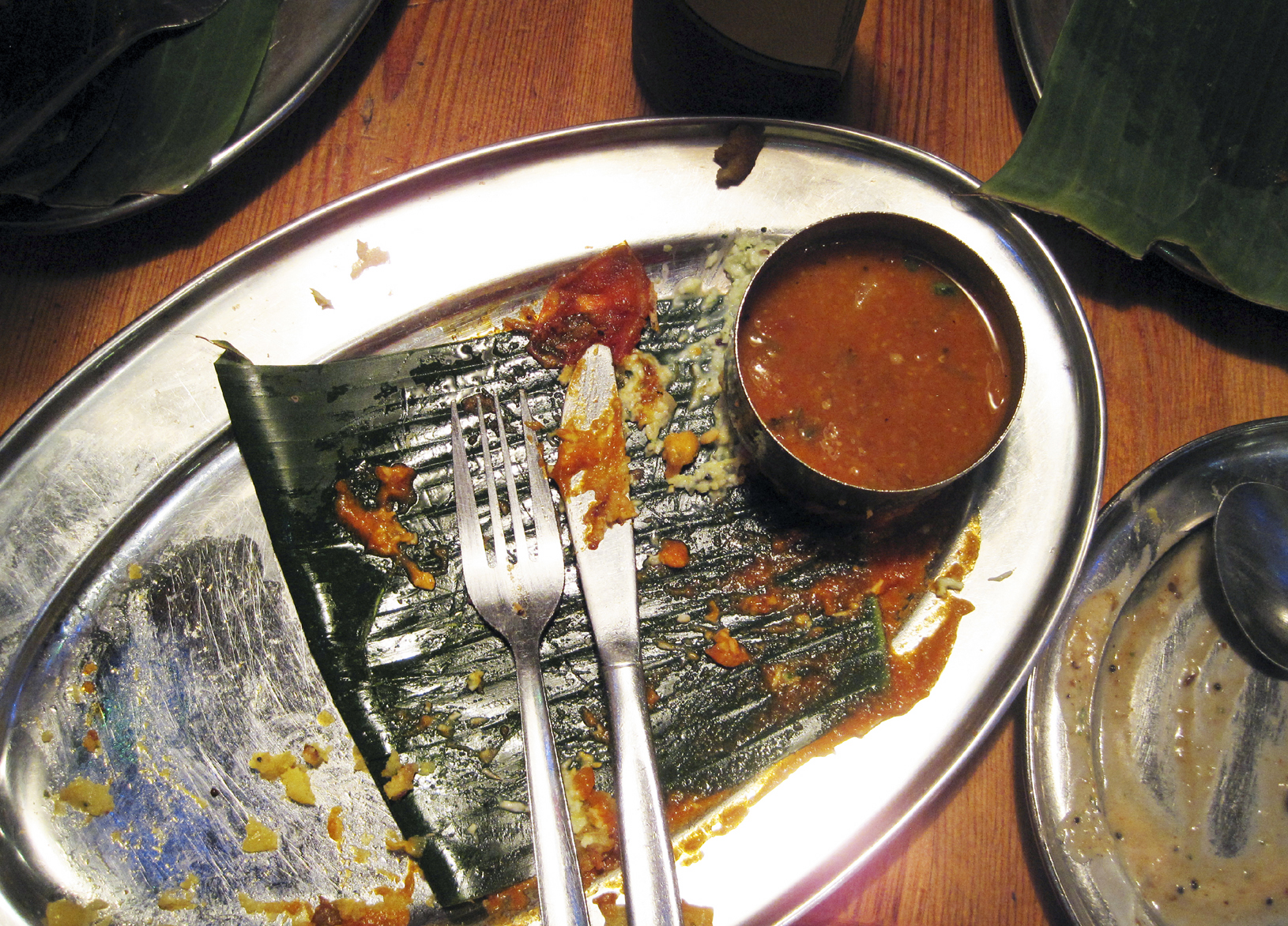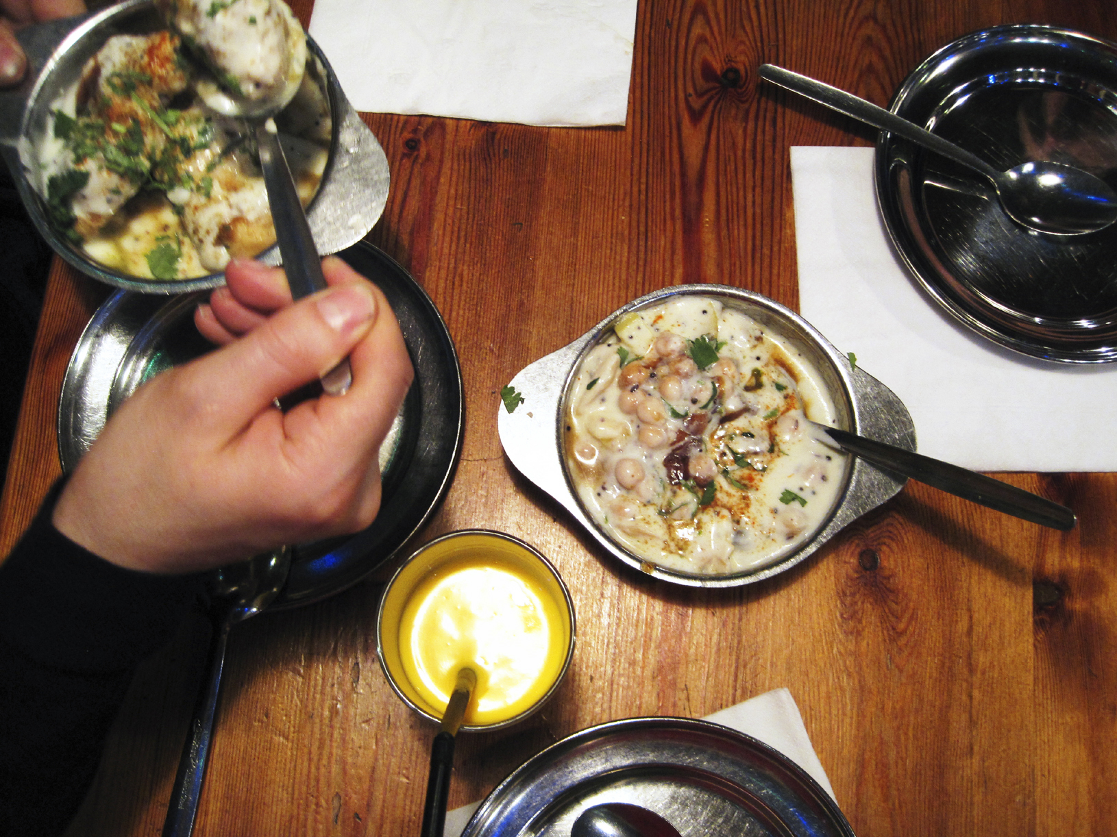Vi valgte ulike forretter blant annet Dahi Vada, kikertfritters med en sur-søt saus av yoghurt og krydre, Aloo Papri Chat, en rett av kikerter, poteter og samme sur-søte saus, samt en Bringel Bhajee, en auberginerett. Til hovedrett hadde vi blant annet Paneer Dosa, en stor og syltynn pannekake som er sprøstekt og fylt med potet og paneerost, blant annet. Thali fra Gujarat var en annen hovedrett som ble bestilt. En nydelig kokoschutney og en hot tomatsaus kom sammen med dosaene, i tillegg til en varm liten suppe. Mmmmm, dette er vanskelig å beskrive uten å ty til klisjeer. Jeg kan bare si at jeg har ikke tenkt på annet siden jeg var her forrige fredag. Hele stedet og atmosfæren og servitørene og maten og alt var helt topp. Det kunne ikke ha vært bedre. Ikke på noen som helst måte.