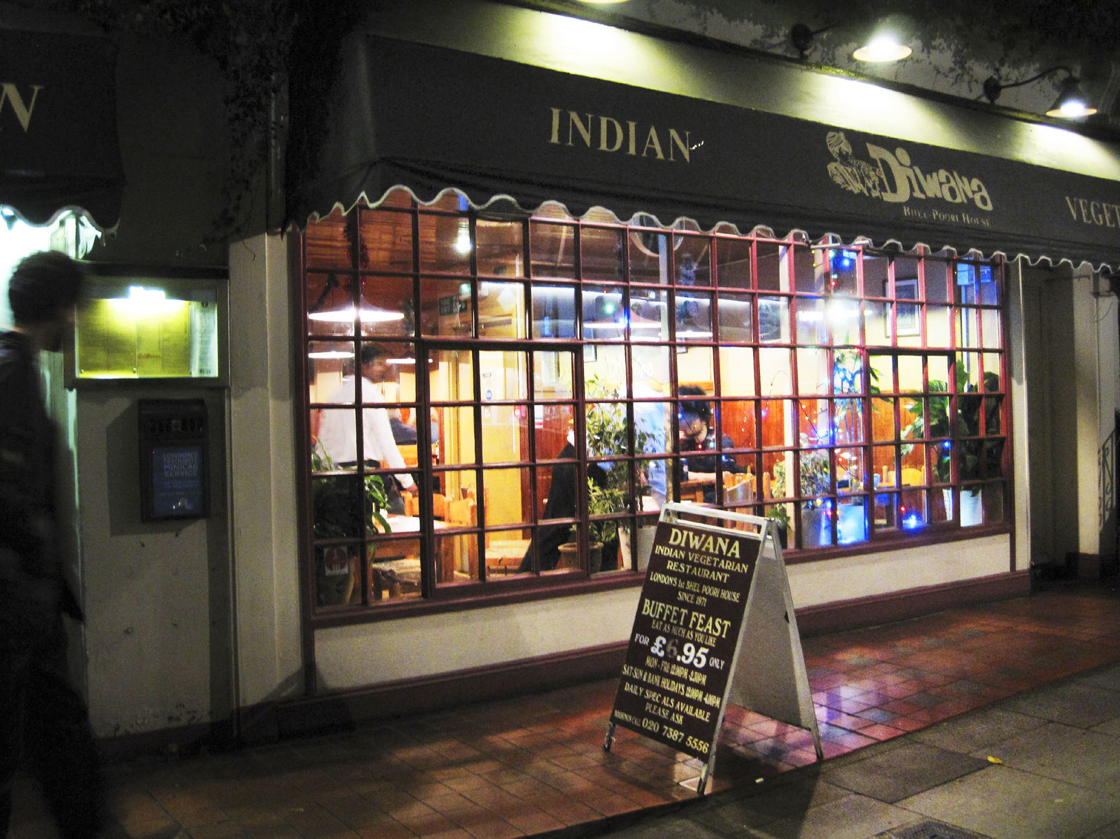 Jeg foreslår at du på en fredag kveld går til Euston Tap først, sånn rundt 18-tida, for et par glass ale og en intenst god pubstemning sammen med londonere. Når du har bygd opp en god sult og nytt deilige humlesmaker, smetter du rundt Euston Station og inn Drummond Street hvor du finner Diwana. I denne restauranten er det billig, det er svært høy kvalitet på maten og alt på menyen er vegetar. I tillegg kan du ta med deg egen alkohol (som f.eks. indisk pils fra kiosken borti gata), eller en flaske vin om du ønsker det. Sprit er ikke tillatt, og du får ikke nyte medbrakt brus – det selger de selv. Kjøp Cobra pils i kiosken og bestill en mangolassi i tillegg.