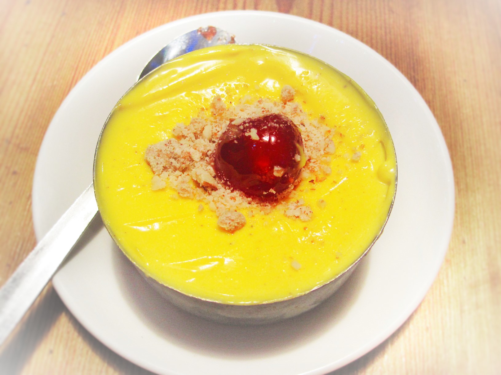 Den gule Shrikhand desserten var en stor overraskelse. I sin beskjedne form så den ikke ut som noe spesielt, men den var en nydelig fløyelsmyk liten søt sak, og det sto i menyen at den var laget av cottage cheese, men det minnet mer om mascarpone i konsistens. I tillegg var det safran og krydre i den. Jeg vil anbefale deg å teste ut selv, og like så en Gulab Jamun, “milky sponge bon-bons” med sirup. Oh, mon dieu, jeg er fortsatt salig av lykke etter dette måltidet.