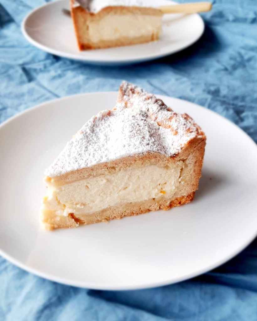 For the filling add all the ingredients in a bowl, apart from the eggs, and mix well with a spoon. Add the eggs and use a mix master to make it very smooth. Butter a 20-22cm round baking dish and sprinkle with flour. Press ca. 2/3 of the pastry at the base of the tin and up to roughly 6-7 cm up the sides. Make sure the pastry is evenly spread out. Pour the ricotta filling (which will be quite thin) into the pastry case. Take the last 1/3 of pastry and roll it into a circle. Place it on top of the ricotta filling and bake at 180 degrees Celsius for 40-50 minutes. Cool down completely and serve with a sprinkle of icing sugar. The cake is even better the day after, when the filling has set and is creamier.
