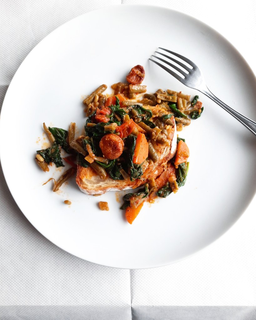 Heat about 3 tbsp of oil in a large frying pan. Sautée the onion until golden. Add the chorizo and fry over medium heat until it starts to get brown. Add celery and fry for a bit longer making sure the onion doesn’t get too dark. Stir in the créme fraîche until melted. Then add the carrot alongside 200ml of water, crumbled stock cube, spices, garlic and seasoning. Stir well and add the tomatoes. Leave to simmer for a few minutes until the tomatoes soften. Add the spinach and stir until wilted, and finally add the green beans. Add more water if necessary. Once you have a thick stew your dish is done! Toast the sourdough bread and spread with the chorizo stew. Delicious! 🧡