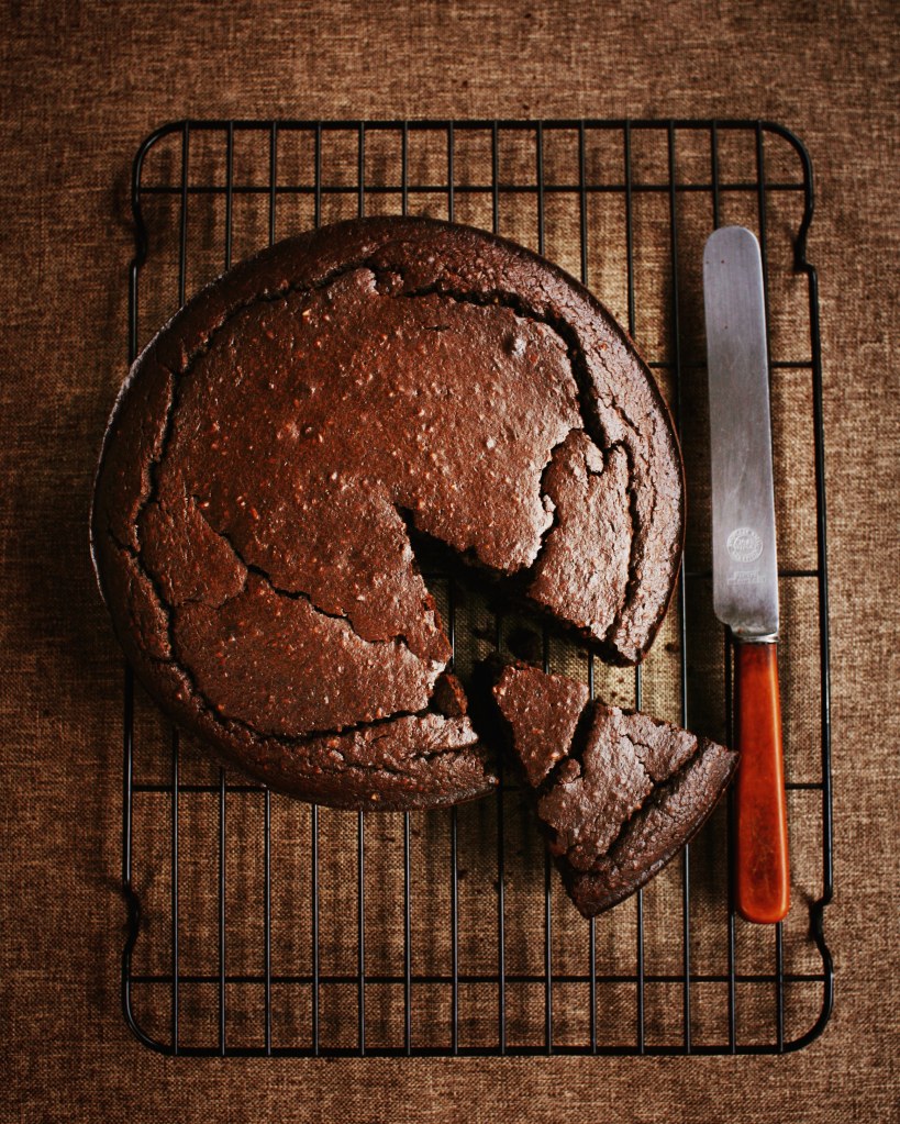 Place the bread (pieces) in a food processor and pulse until you have fine crumbs. Melt the butter with the chocolate and the milk as well as the sugar, until you have a smooth mixture. Leave to cool a little. Place all the dry ingredients in a bowl and stir in the butter and sugar mix, as well as beaten eggs. Pour the cake batter into a 24cm buttered cake tin and bake for 45-50 min on 190 degrees celsius.