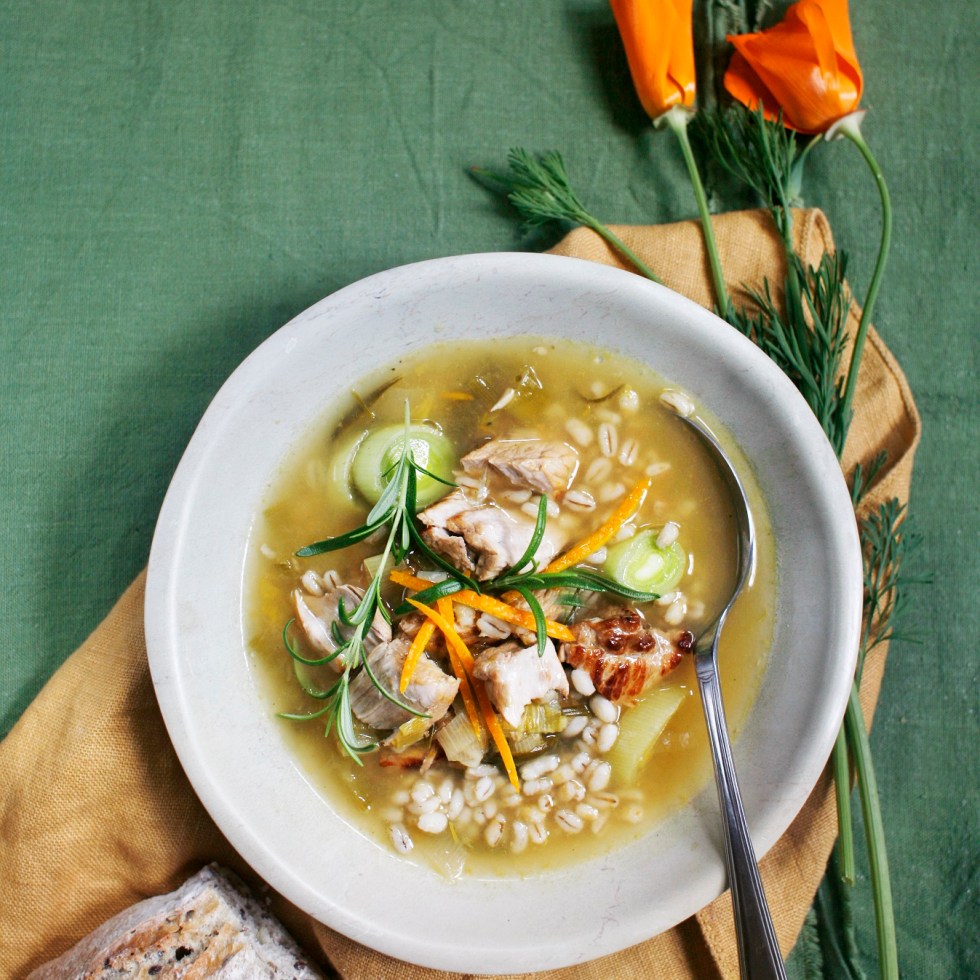 Suppe med slow-cooked svin, rosmarin og byggryn